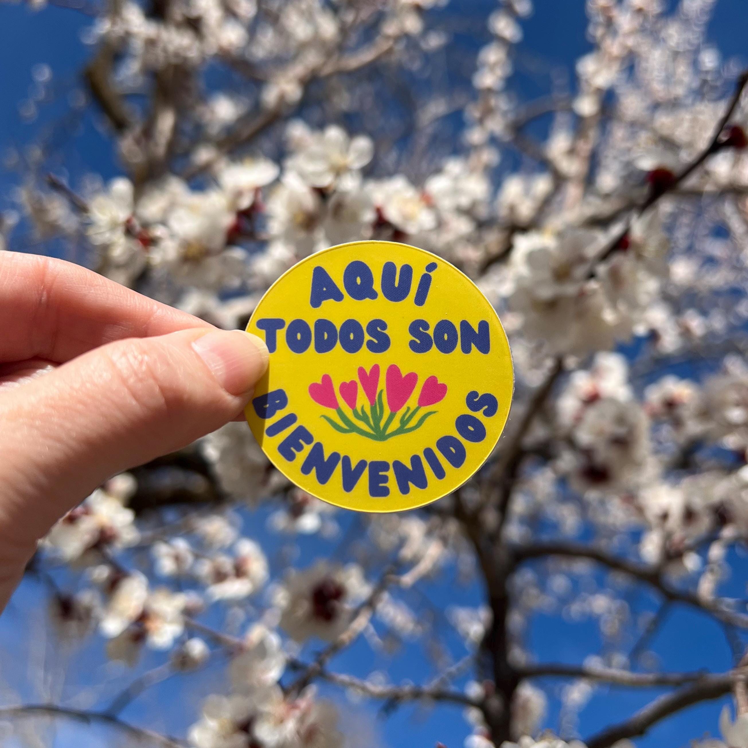 This little sticker reads "aquí todos son bienvenidos" ("all are welcome here"). With a yellow background and cornflower blue text, it features a hand-drawn design with heart-shaped flowers. The round sticker measures 2 inches (5 centimeters) across, and is dishwasher safe and weatherproof for up to five years. It has a shiny finish, and is printed on white vinyl.